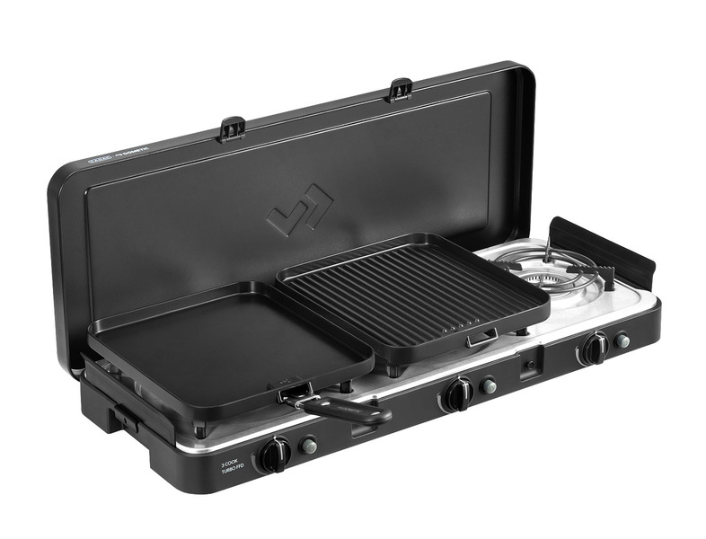 Inkl.: Topfständer, flache Platte, gerippte Platte, abnehmbarer Griff, Windschutzbleche und Trage-/Aufbewahrungstasche. Leistung: 2,2kW + 1x 1,5kW, Für den Außen und Innenbereich geeignet