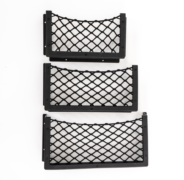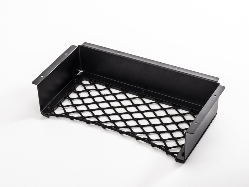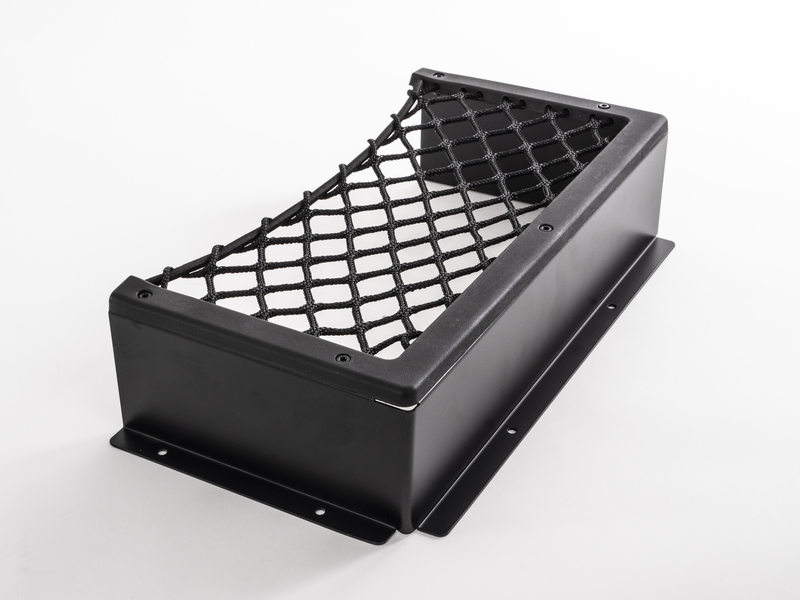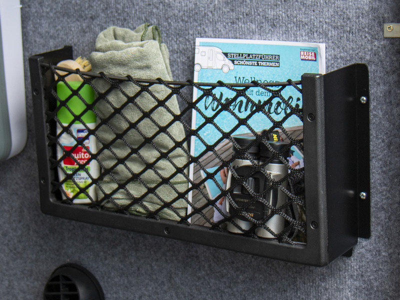 Ablagefach Komplettset mit stabilem Aluminiumrahmen und elastischem Netzgewebe, vormontiert und plug and play. Es schafft im Fahrzeug zusätzlichen Stauraum für Utensilien. Bohrungsdurchmesser 4,5 mm.