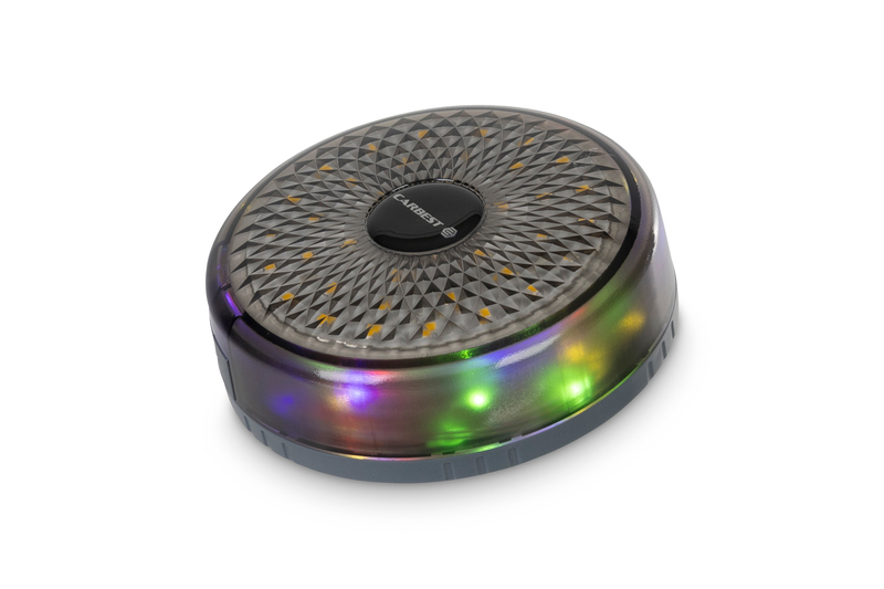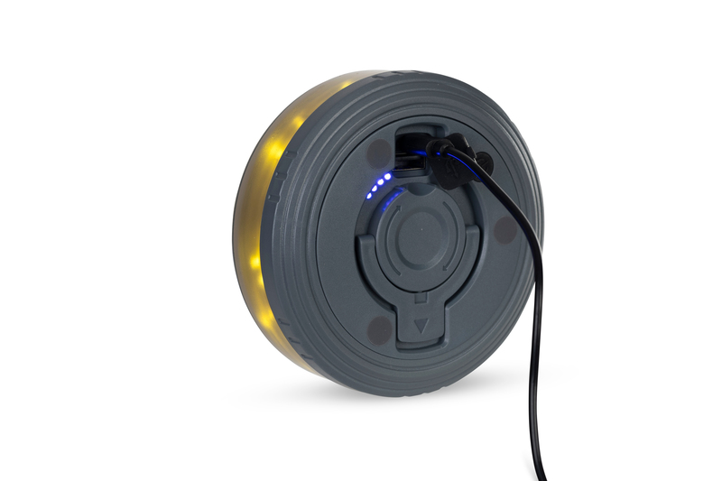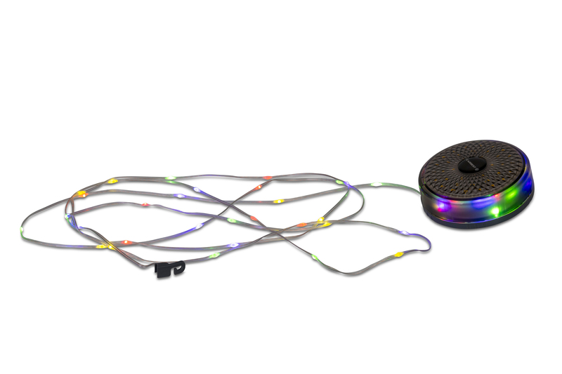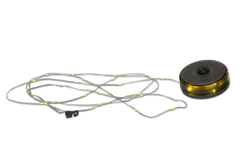 Wiederaufladbarer 1800 mAh Lithium-Akku. Integrierte, ausrollbare Lichterkette (8 m Länge). Warmweißes Licht oder verschiedene Leuchtvarianten der RGBW-Lichterkette einstellbar.