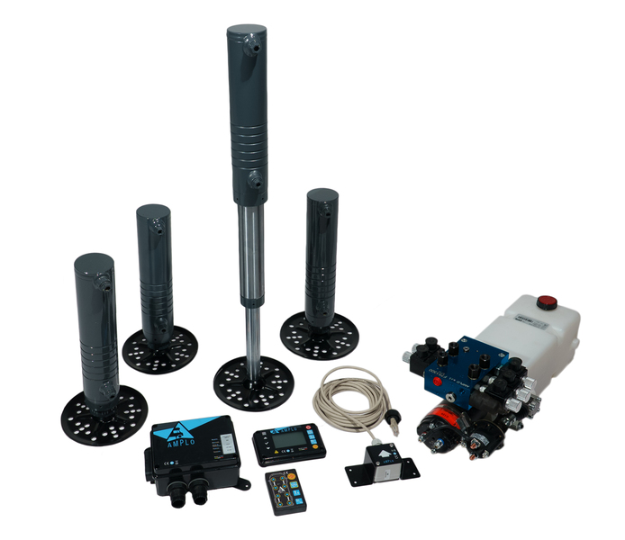 Handliche Funk-Fernbedienung für alle automatische Funktionen. Der Nivellierungssensor kann unter dem Fahrzeug platziert werden. Digitales Display zur Kontrolle und zur manuellen Steuerung des Systems. Eine Nivellierung der Achsen oder der Fahrzeugseiten ist ebenfalls möglich. Zusätzliche Parkfunktion per Knopfdruck auf dem Display. Fahrzeug stabilisiert (Parkfunktion), ohne es vollständig anzuheben. Hubstützen fahren in ca. 33 Sekunden wieder ein. Das 12 V-System ist passwortgeschützt und verfügt über eine Notfalltaste, die das System sofort stoppt. Zur Installation des Systems werden fahrzeugspezifische Adapter sowohl für die Front- als auch die Heckachse benötigt. Eine Wiegefunktion ist optional nachrüstbar (siehe optionales Zubehör).