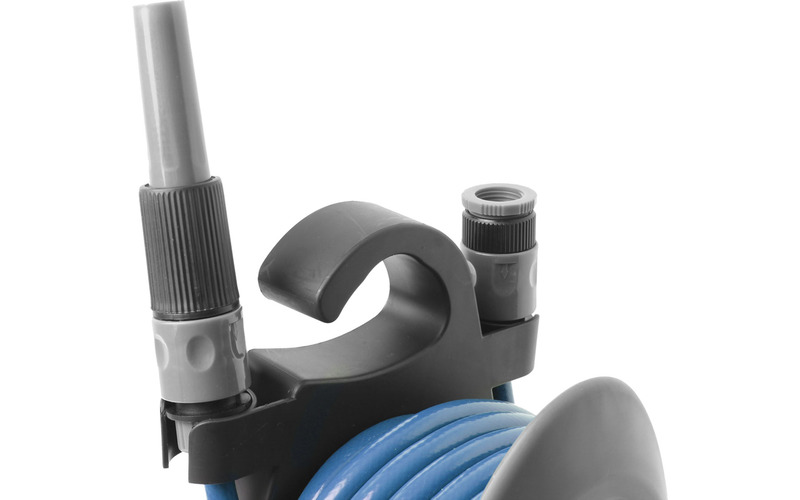 Tragbare Schlauchtrommel in grau mit lebensmittelechtem 3/8“ PVC-Schlauch in blau und 2 Schnellkupplungen. Gestell aus widerstandsfähigem Kunststoff. Komplett mit Spritzdüse.
