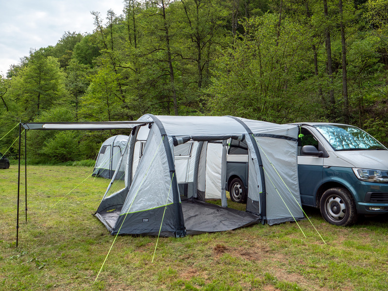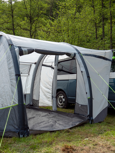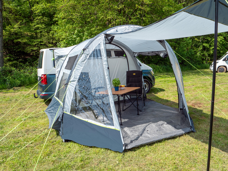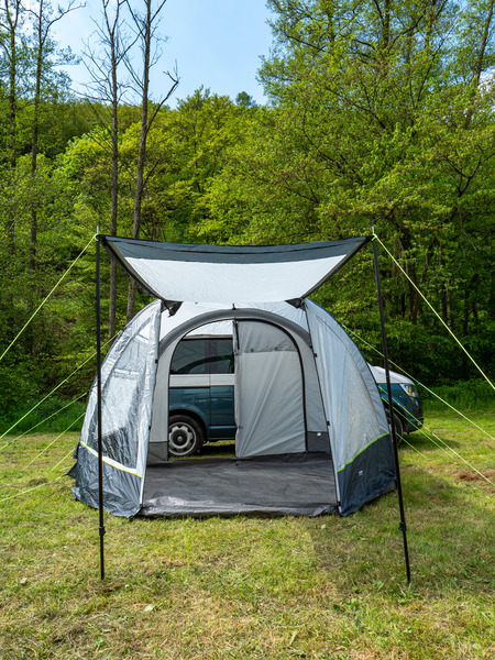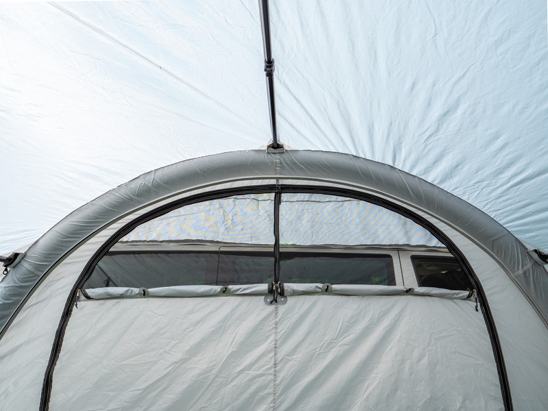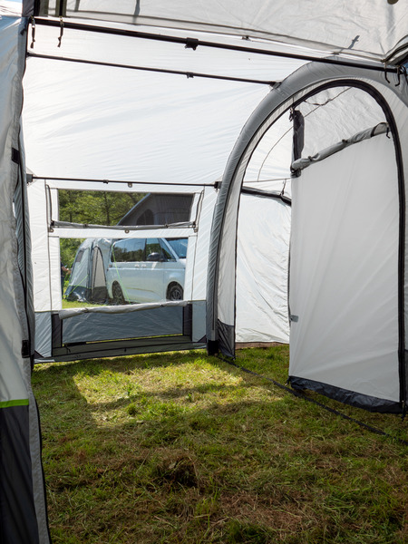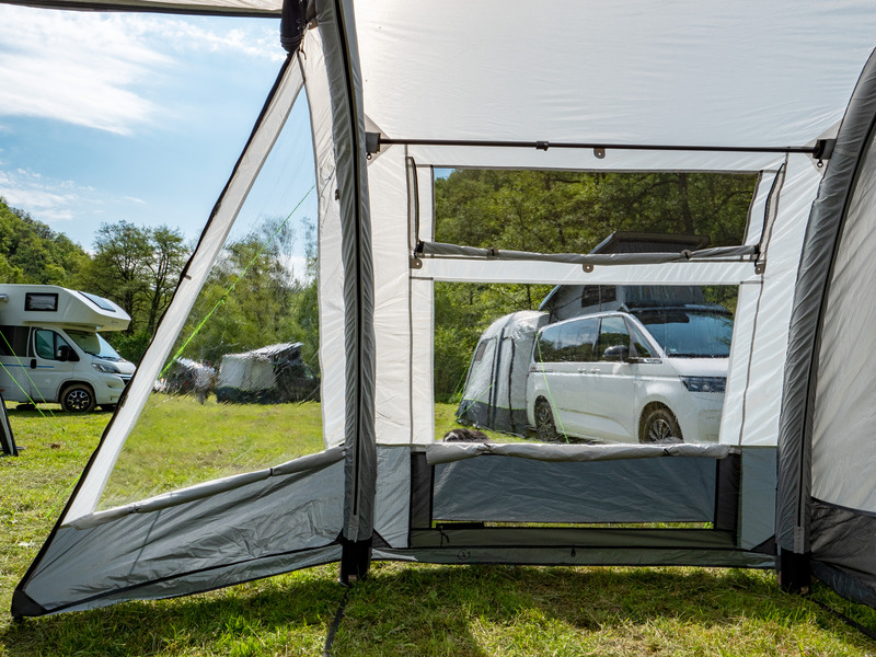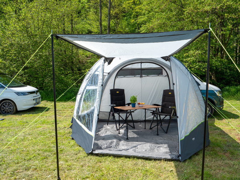 Der Klassiker: 1-Tunnel-Vorzelt jetzt mit Lufttechnologie. Die große Fronttür ist zusätzlich mit Moskitonetz ausgestattet und kann als Sonnensegel genutzt werden. Tür in Seitenwand mit 1/3 Moskitonetz und 2/3 transparente PVC-Folie. Schleuse zum Fahrzeug mit Türen in beiden Seiten, Bodenbelüftung, Moskitonetz in Rückwand.