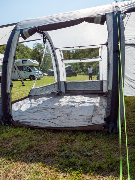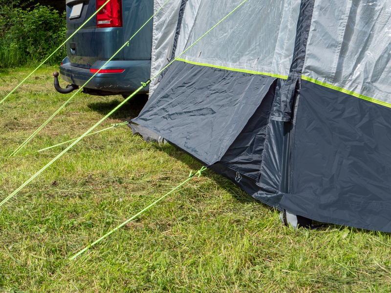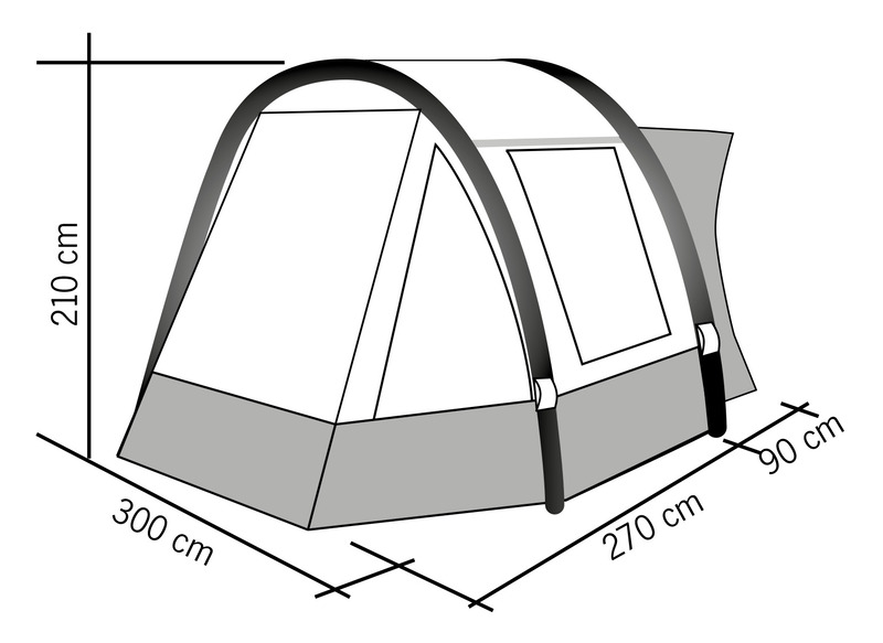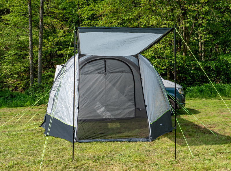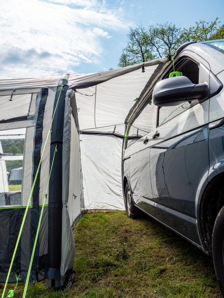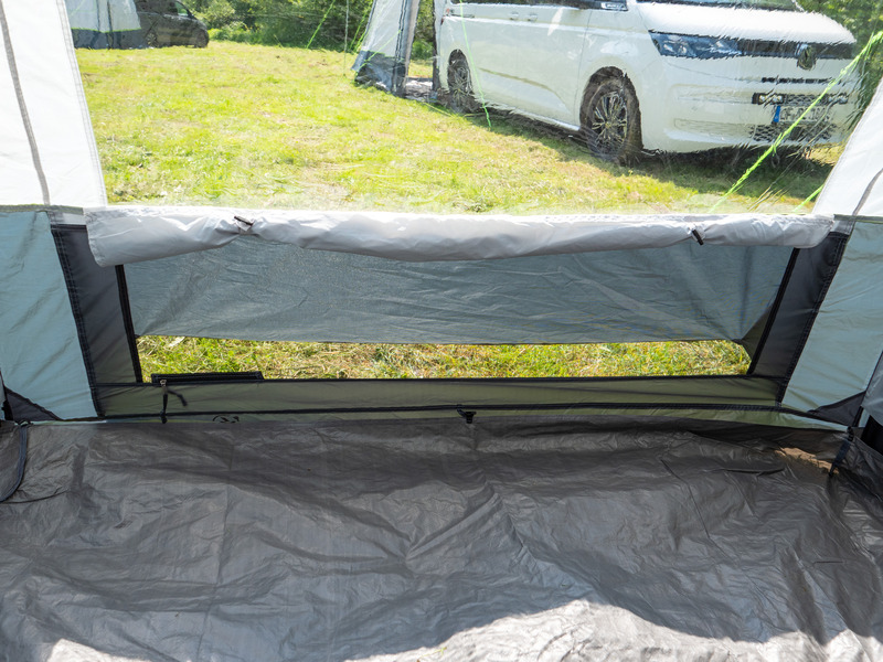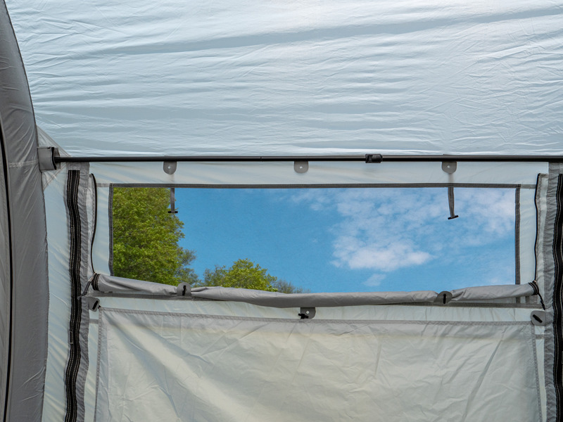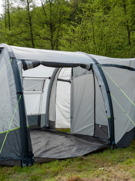 Der Klassiker: 1-Tunnel-Vorzelt jetzt mit Lufttechnologie. Die große Fronttür ist zusätzlich mit Moskitonetz ausgestattet und kann als Sonnensegel genutzt werden. Tür in Seitenwand mit 1/3 Moskitonetz und 2/3 transparente PVC-Folie. Schleuse zum Fahrzeug mit Türen in beiden Seiten, Bodenbelüftung, Moskitonetz in Rückwand.