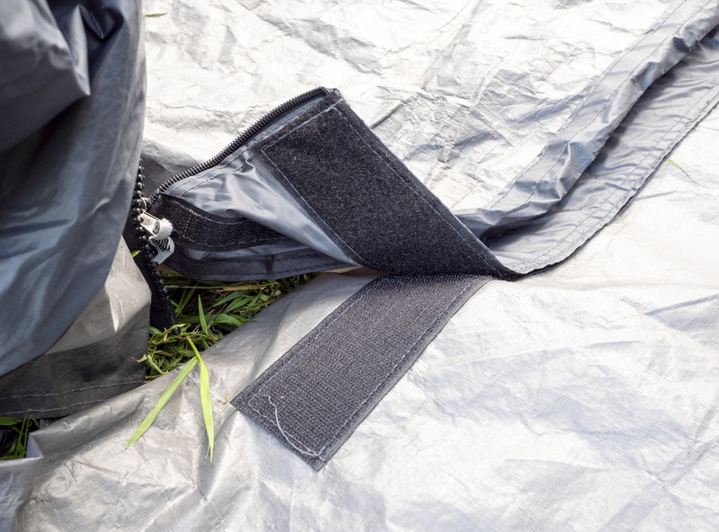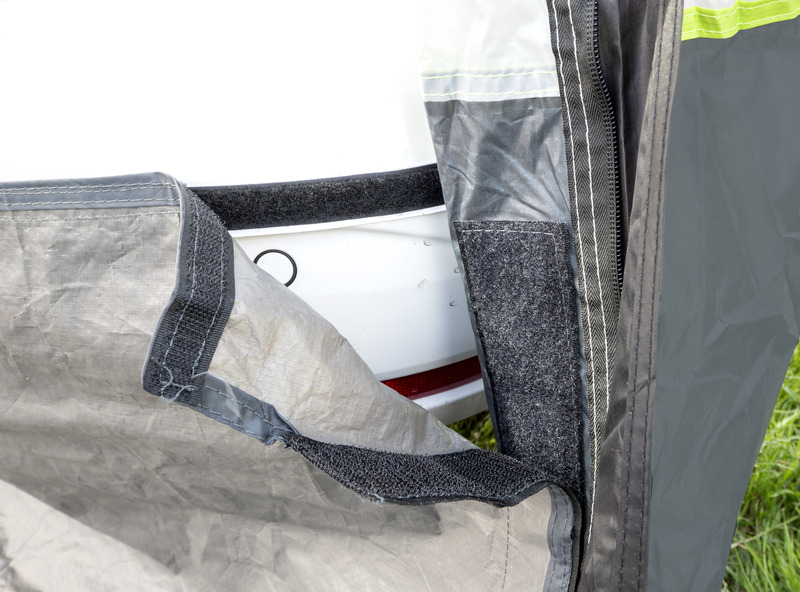 Anbringung am Fahrzeug: Einfach über die geöffnete Heckklappe ziehen und mit Heringen seitlich abspannen.