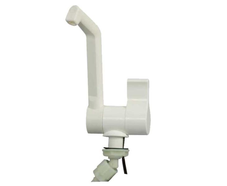 Dreh- und schwenkbarer Auslauf. Drehweg des Knopfs nur 90°. Geringe Einbauhöhe. Mit Automatikschalter (max. 3 A), Druck max. 3 bar. Durchfluss regelbar. Bohrung Ø 22 mm.