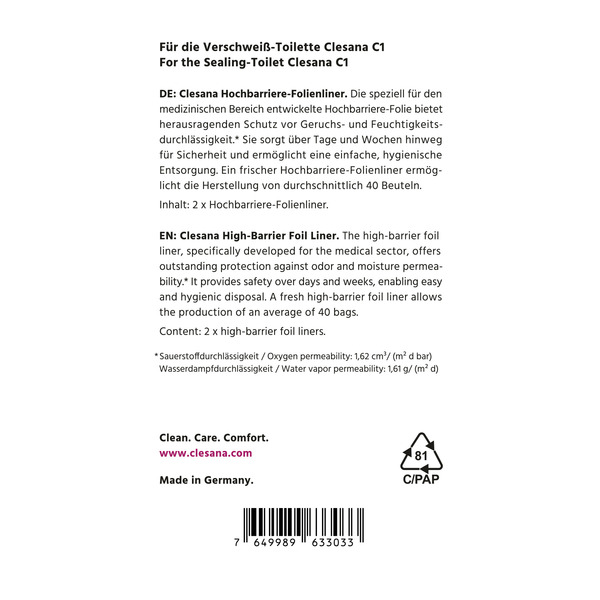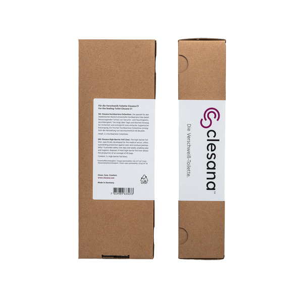 Ausscheidungen und Toilettenabfälle werden hygienisch in Mehrschicht Barriere-Folie verschweißt. Die Barrierefunktion der Folie erlaubt, die Beutel über mehrere Tage absolut hygienisch und geruchsdicht zu lagern. Ein frischer Barriere-Liner erlaubt unter Verwendung der Standardbeutelgrößen* bis zu 38 kleine oder 26 große Toilettengänge.