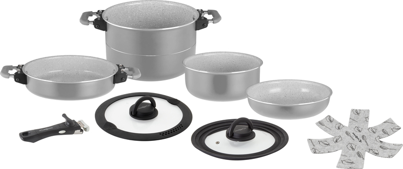 ✔ 1 Topf, 1 Kasserole, 2 Pfanne, 2 Deckel, 1 Griff