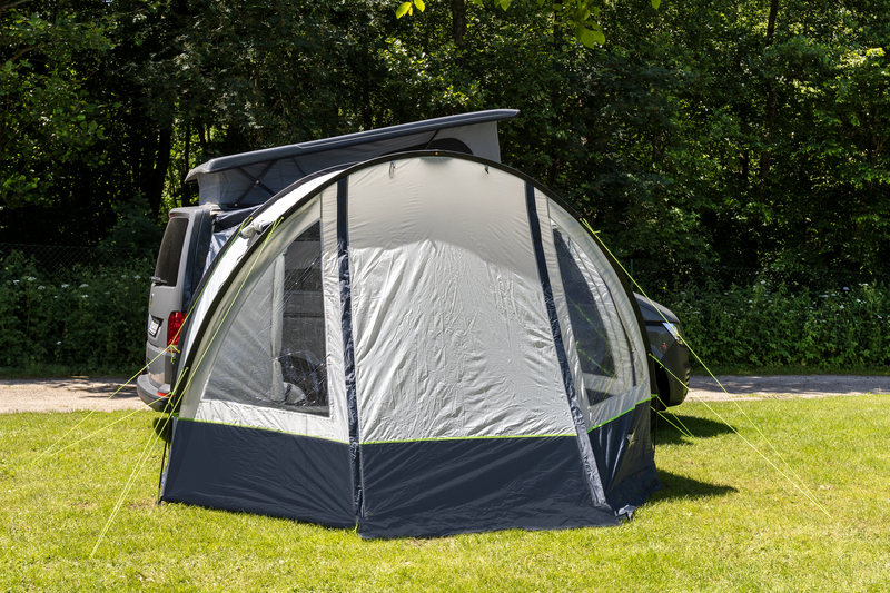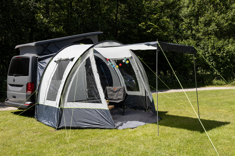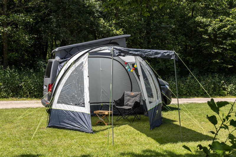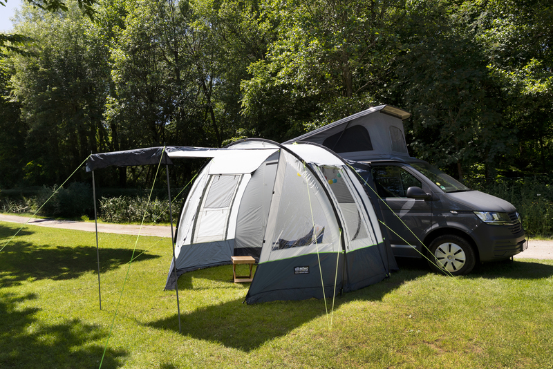 Die Einsteiger-Modell für Campingbusse. Das 1-Tunnel-Vorzelt für Vans mit großer Tür in der Front, die auch als Sonnensegel einsetzbar ist. In beiden Seiten Fenster mit 1/2 Moskitonetz und 1/2 transparentes PVC. Zusätzliche Tür in rechter Seitenwand (auch als Sonnensegel nutzbar), D-Shape Tür in Rückwand (ein- oder beidseitig zu öffnen) und Schleuse (45cm). Inkl. 3 Dachverstärkungsstangen für mehr Stabilität und zur Vermeidung von Wassersäcken bei Regen.