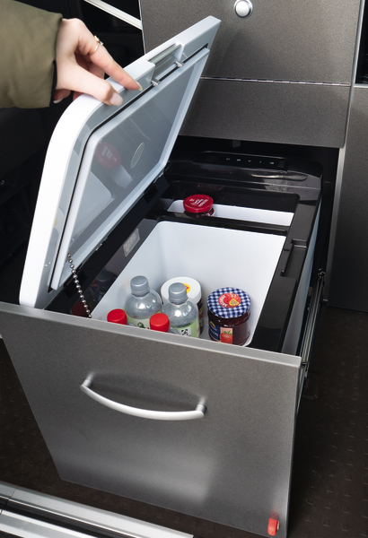 Das Einrichtungsmodul CaliSchrank bietet eine vielseitige Ausstattung. Der in Richtung der Sitzbank angebrachte Klapptisch dient als Ess- oder Arbeitstisch. Über dem arretierbaren Auszug für eine große 26-l-Kompressorkühlbox (optional) befindet sich
