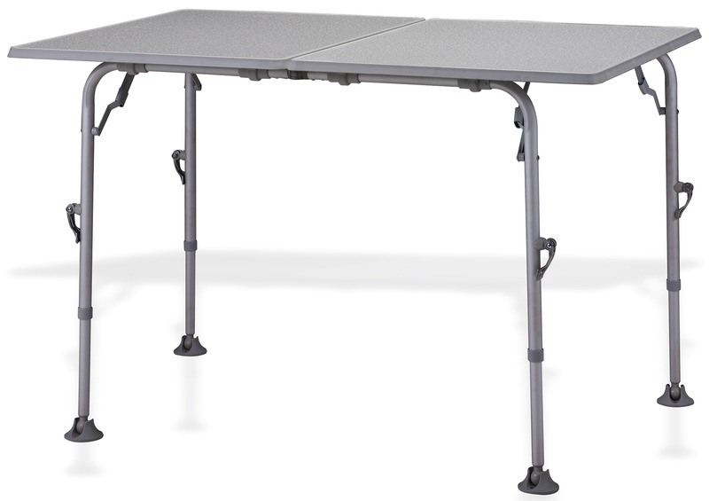 Aluminiumtisch Extender mit einer wetterfesten, hellen und großen Tischplatte. Die großen Tellerfüße verhindern ein Einsinken.