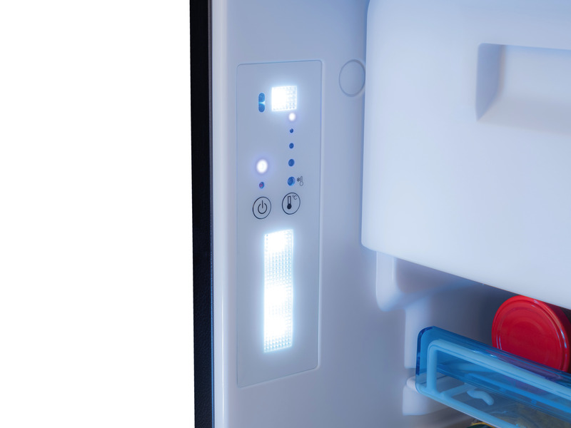 Kompressor-Einbaukühlschrank 12V/24V mit 42 Liter Kühlfach und 4,5 Liter Gefrierfach. Die Temperatur ist über ein modernes LED-Display regelbar, welches flächenbündig in die Innenwand des Kühlschranks eingelassen ist. Integrierte LED-Beleuchtung im Innenraum. Türanschlag rechts (nicht versetzbar).