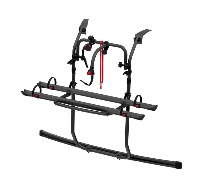 Teleskopischer Auflagebügel aus Stahl und Aluminium. Ermöglicht die Montage der Auflagebügel in 3 Positionen: Standard, mittig und unten (beide letzteren machen den Gebrauch einer zusätzlichen Kennzeichenrückleuchtleiste erforderlich). Ermöglicht das Öffnen der Heckklappe mit montiertem Fahrradträger, ohne Fahrräder.