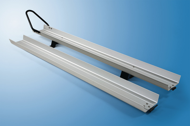 Sicherer Halt für das Motorrad in der Heckgarage, im Caravan oder Reisemobil. Motorrad- und Auffahrschiene werden beim Beladen miteinander verbunden. Motorradschiene 202 cm lang und 14 cm breit mit einem beweglichen Haltebügel vorne und einem Sicherungskeil hinten. Auffahrschiene 180 cm lang und 14 cm breit. Mit 2 stabilen Riemen zur Sicherung des Motorrades während der Fahrt. Aus eloxiertem Aluminium. Traglast bis 200 kg.