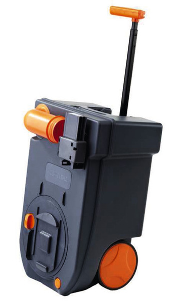 17,5 l Fäkalientank mit eingebauten Rädern und herausziehbarem Handgriff. Montage der Service-Tür im Querformat.