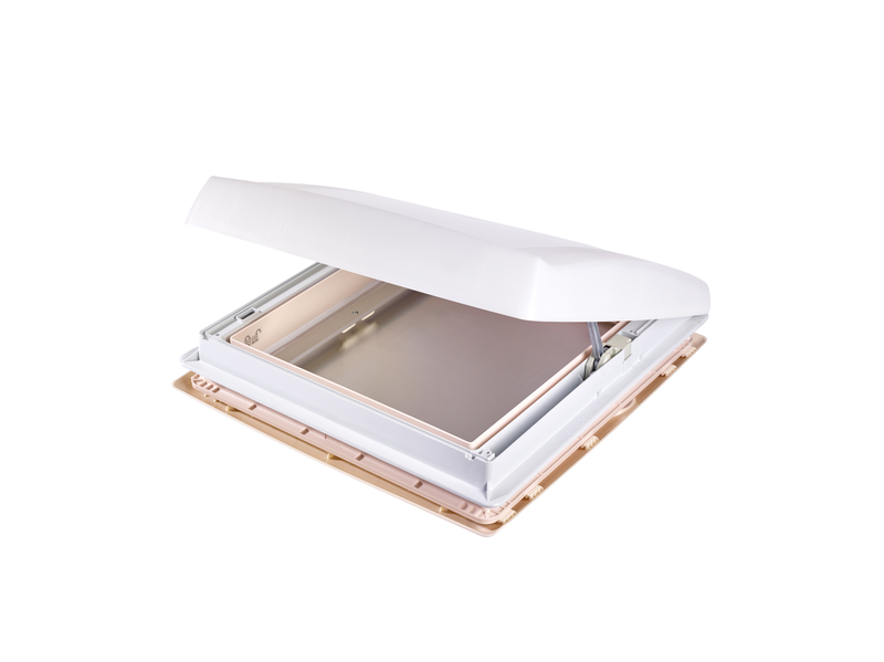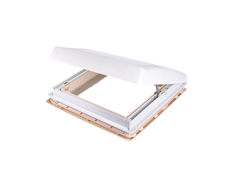 Kurbeldachhaube für Wohn-, Toilatten, Schlafraum usw. Hell und luftig, mit Verdunkelungsrollo und Moskitonetz. Aus schlagfestem, wetterbeständigem Kunststoff. Aerodynamische Form sorgt für hohen Anpressdruck und Dichtigkeit. Weit überstehende Außenkuppel bietet Schutz auch bei starkem Regen. Bedienkurbelknopf liegt an der Seite, dadurch entsteht eine vollständig freie Öffnung.