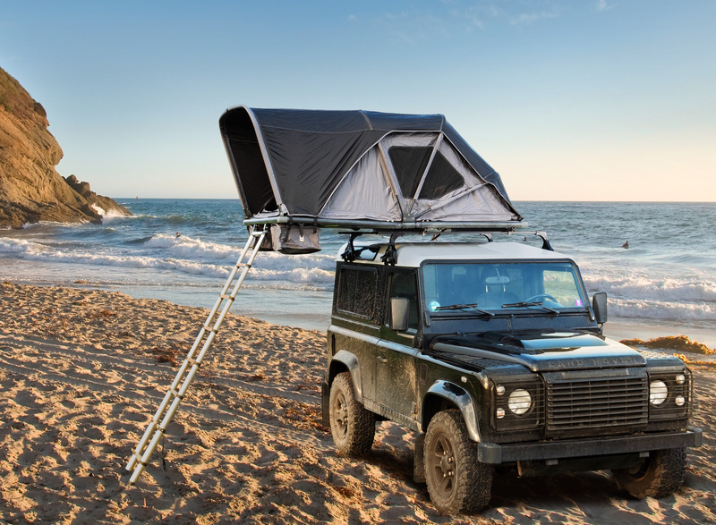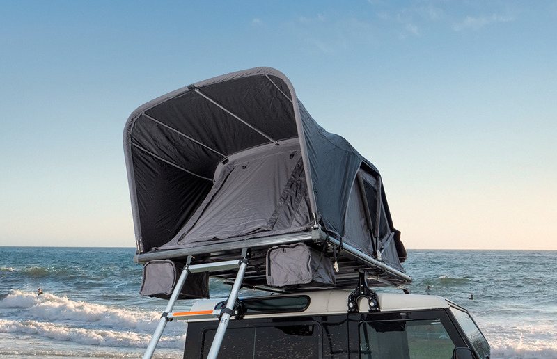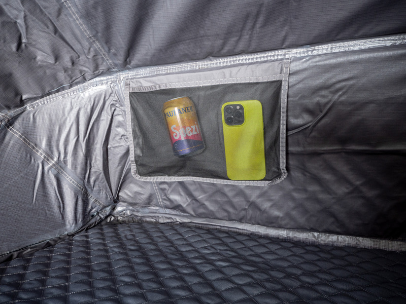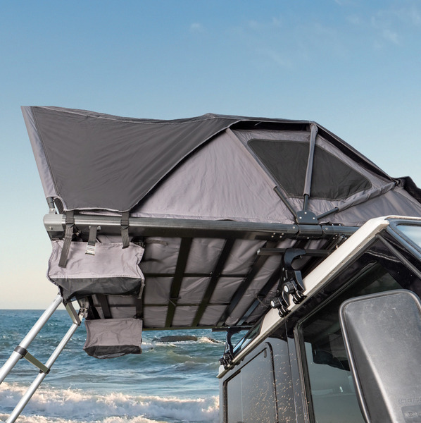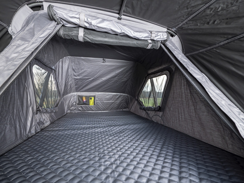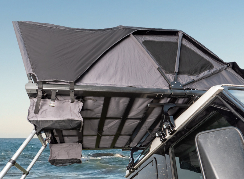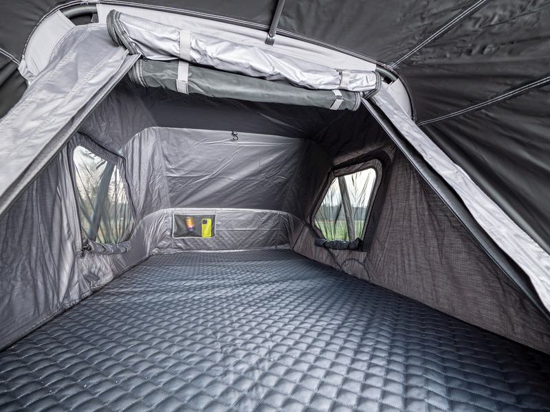 Dachzelt in neuem Design zum manuellen Aufklappen – geeignet für PKW, Van und SUV. Das Dachzelt ist schnell aufgeklappt. Es ist ausgestattet mit Moskitonetzen in allen Öffnungen (3 Seiten), 2 praktischen Schuhtaschen am Eingang außen, einer 7 cm dicken bequemen Matratze und einer Aluminium-Teleskopleiter. Der Unterboden besteht aus einem stabilen Aluminiumrahmen.