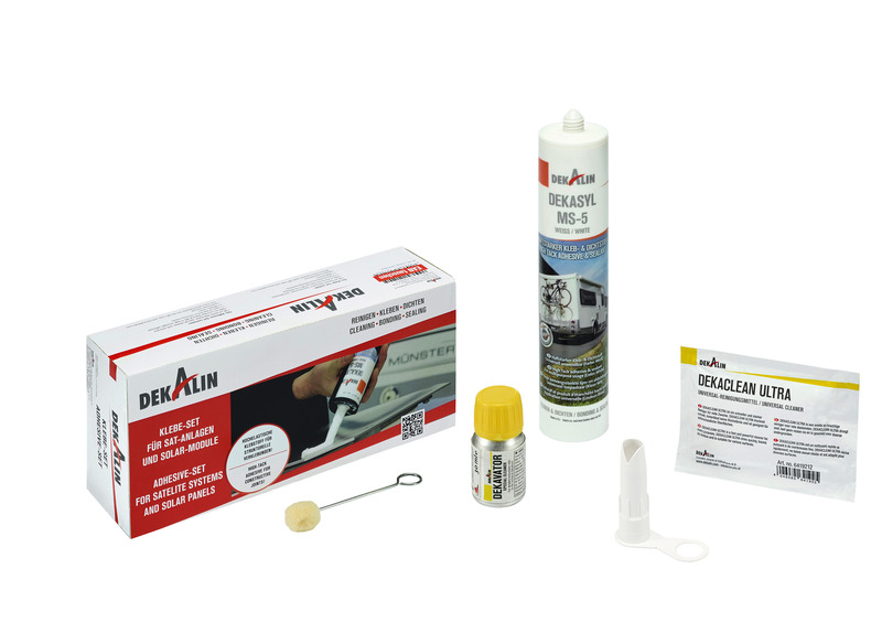 Das DEKALIN Klebeset ist alles, was man benötigt zum Verkleben von Solarmodul-Spoilern, halbfl exiblen Solarmodulen oder auch Dachdurchführungen.