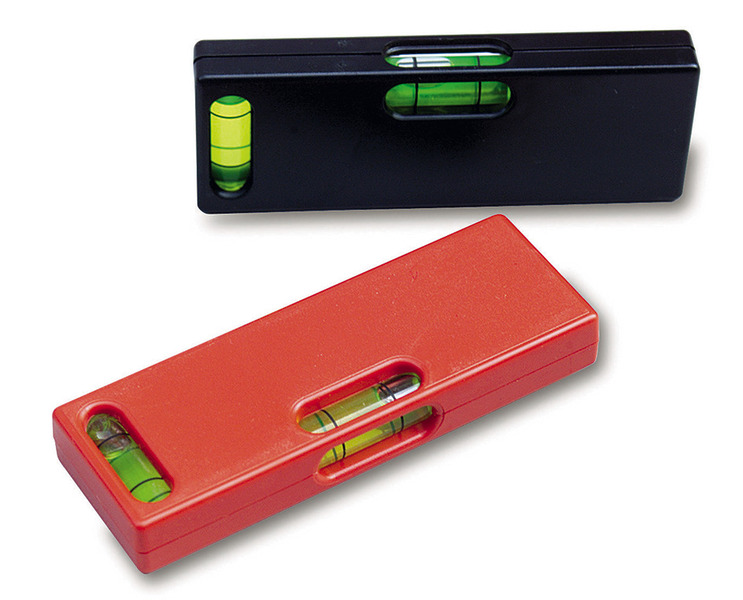 Kleine Doppelwasserwaage mit senkrecht zueinander stehenden Libellen. Farblich sortiert (schwarz oder orange).
