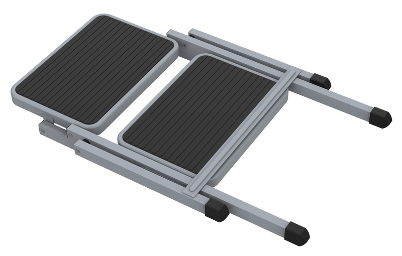 Klappbare Doppeltrittstufe, aus Stahl mit Antirutschbeschichtung.