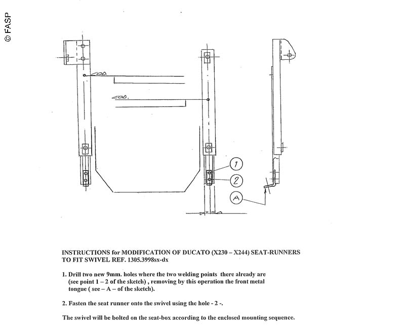 Drehkonsole für Pilotensitz von FASP oder Originalsitz. Höchste Stabilität und Festigkeit durch verstärkte Rippen. Drehpunkt leicht zurückgesetzt, dadurch kein Anstoßen an den Fahrzeugseiten. Roter Entriegelungshebel dreht sich mit oberer Platte und ist somit nicht störend. Geringes Gewicht. Für Fiat Ducato X230 (1994-2002) und X244 (2002-2006).