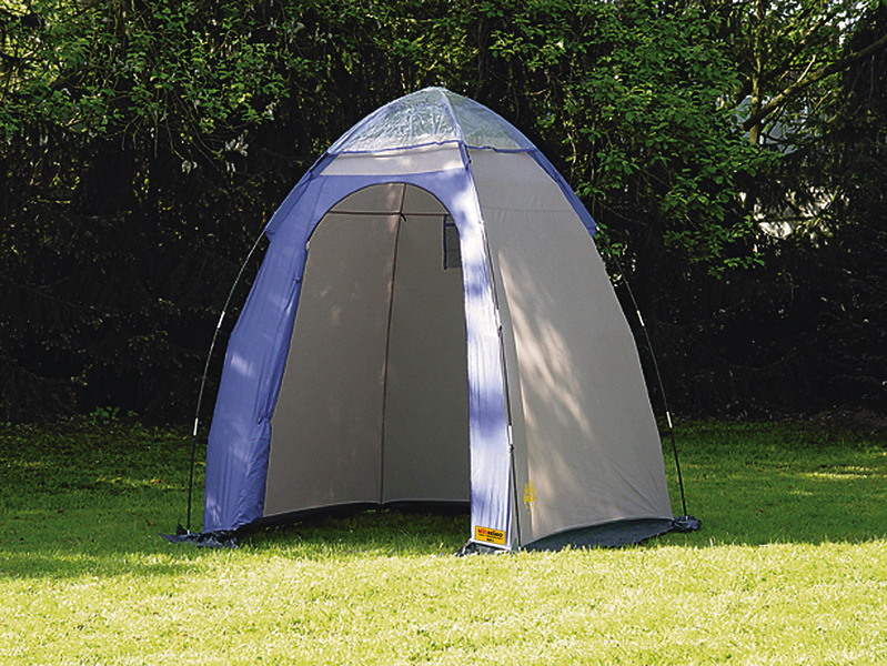 Auch als Toilettenzelt oder portable Umkleidekabine am Strand verwendbar. Elegante Kuppelform, Klarsichthaube oben, praktisches Aufbewahrungsnetz an der Rückwand.