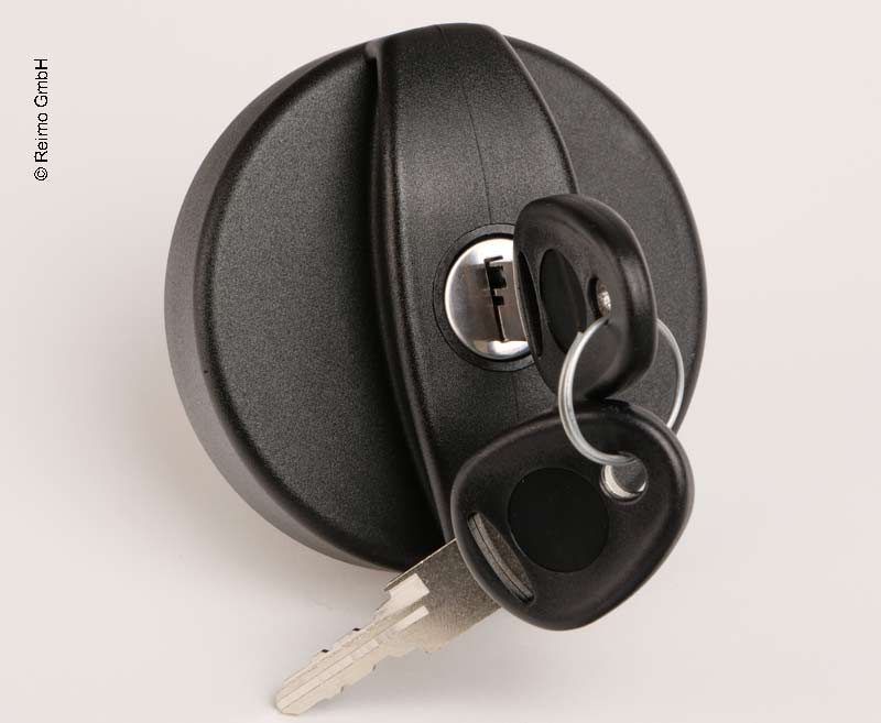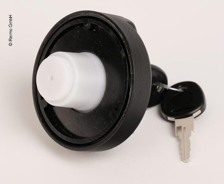 Abschließbarer Ersatzfüllstutendeckel in schwarzer Ausführung mit integriertem Schließzylinder und 2 Schlüsseln.