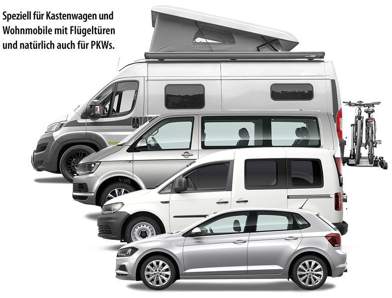 Zum Transportieren von zwei Fahrrädern auf der Anhängerkupplung speziell für Kastenwagen und Wohnmobile, Familienbusse, Hochdachkombis mit Flügeltüren sowie PKWs. 70 cm Schiebeweg ermöglicht die Öffnung von bis zu ca. 85 cm breiten Türen.