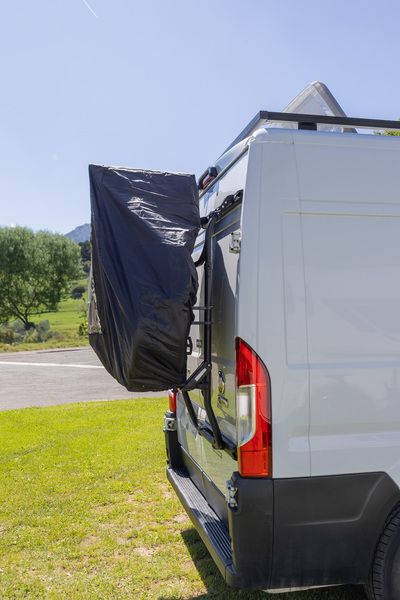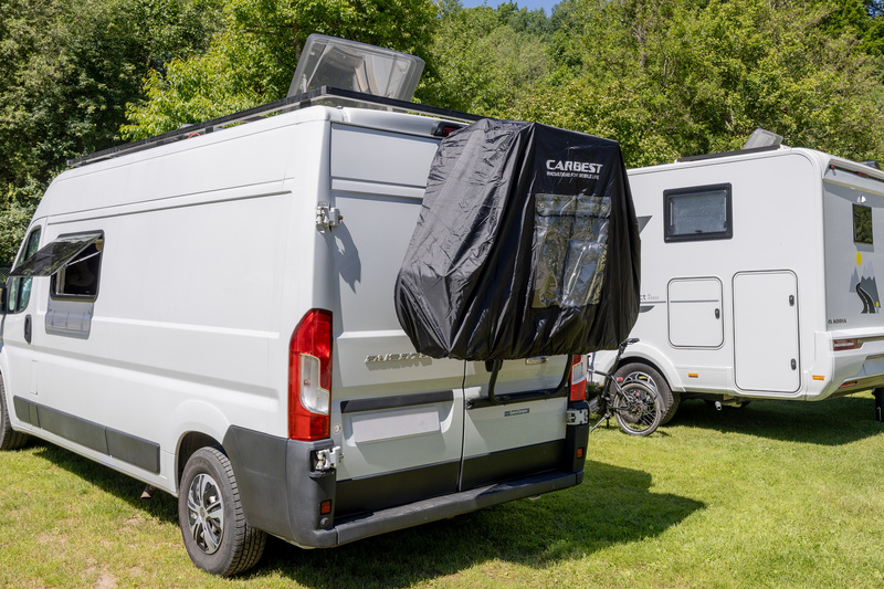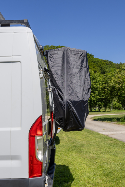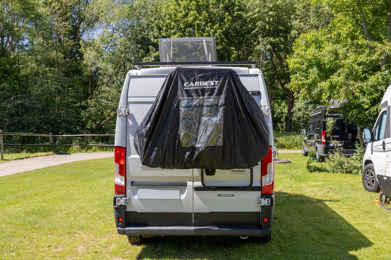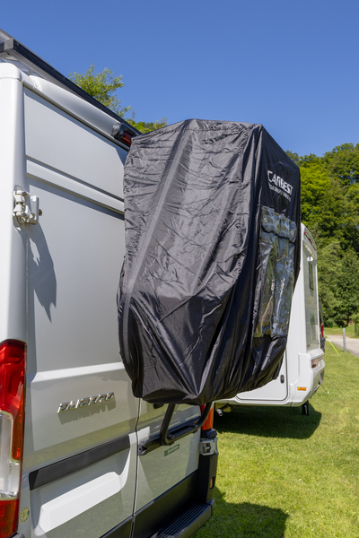 Die schwarze Reisemobil-Fahradschutzhaube wird aus Polyester gefertig und ist wasserfest. Inklusive Tasche für Warntafel und Innenband zum fixieren.