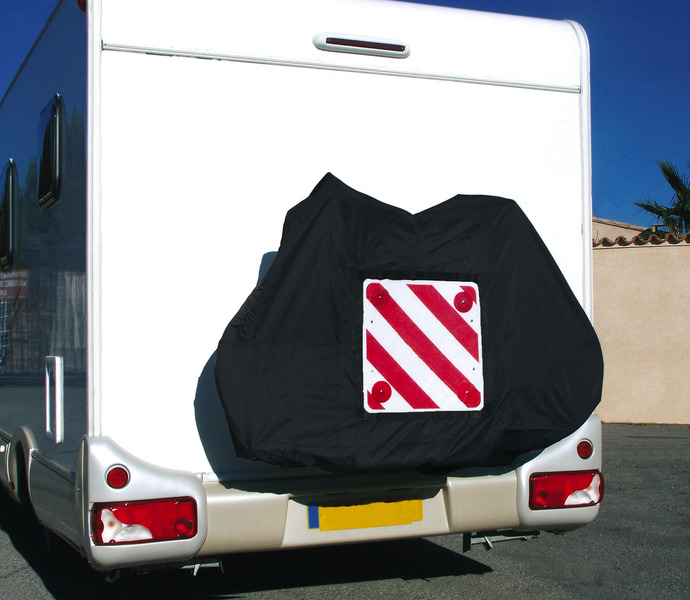 Die schwarze Reisemobil-Fahradschutzhaube wird aus Polyester gefertig und ist wasserfest. Inklusive Tasche für Warntafel und Innenband zum fixieren.