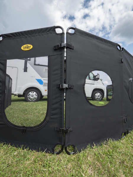 Das Hundefreigehege ist faltbar und wird in einer praktischen Tragetasche geliefert. Damit können Sie Ihrem Hund eine Rückzugsmöglichkeit geben und Sie selbst können entspannen, da Sie Ihren Hund sicher im Gehege wissen. Es besteht aus 8 Panels, die per Klett miteinander verbunden sind und flexibel gestellt werden können. 1 Panel ist mit einer Tür aus Netz ausgestattet, die per Reißverschluß geöffnet wird. Die anderen 7 Panels haben runde Netz-Fenster. Dadurch hat der Hund jederzeit Frischluft im Gehege. Außerdem gehören Heringe zum Lieferumfang, um das Gehege am Boden zu fixieren. Beliebig viele Gehege können miteinander verbunden werden.