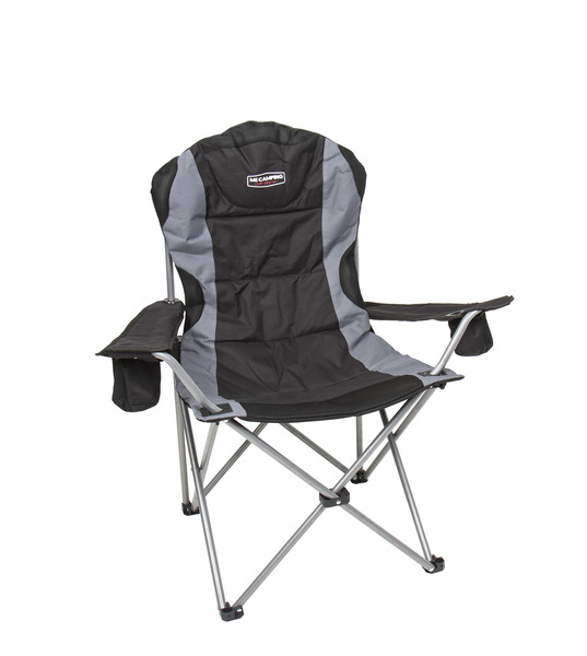 Der gepolsterte Faltstuhl Toledo ist mit einem Handgriff zusammengefaltet und geöffnet. In beiden Armlehnen befindet sich je ein Becherhalter. Das Kopfteil in der Rückenlehne kann per Reißverschluß geöffnet, um darin die Packtasche zu verstauen und ein Kopfkissen zu „zaubern“. Durch das silberne Stahl-Gestell und das hochwertige 600D Polyster-Material in schwarz/grau wird dieser Faltstuhl zum unentbehrlichen Campingstuhl für alle Gelegenheiten.