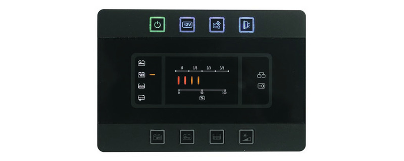 Mikroprozessorgesteuertes Komplettsystem mit LED Control Panel zur Überwachung der Fahrzeug- und Verbraucherbatterie (B1-B2), Überwachung des Frischwassertanks, Alarm bei vollem Abwassertank, Pumpe, Außenlicht, Relais für den parallelen Anschluss der Batterien, Kühlschranksteuerung, Sicherungen, Nachladung der Fahrzeugbatterie, Überwachung und Steuerung der Einrichtung für den Batterieschutz, Dämmerungssensor. Maße Control Panel: 190 x 130mm.