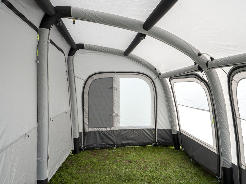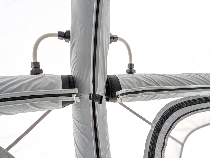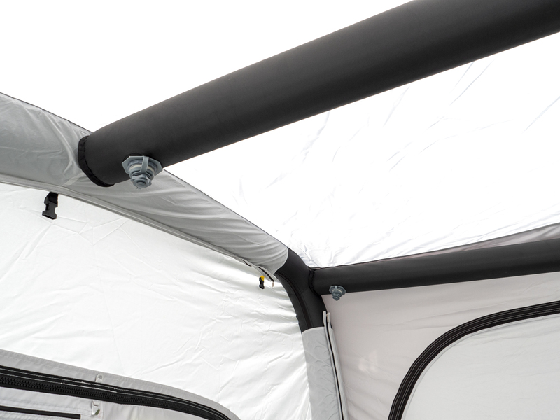 Die 3 vertikalen Haupt- und 2 vorderen horizontalen Dachverstärkungs-Luftschläuche sind als SINGLE INFLATION-System miteinander verbunden. 4 weitere horizontale Luftschläuche sind separat aufblasbar.