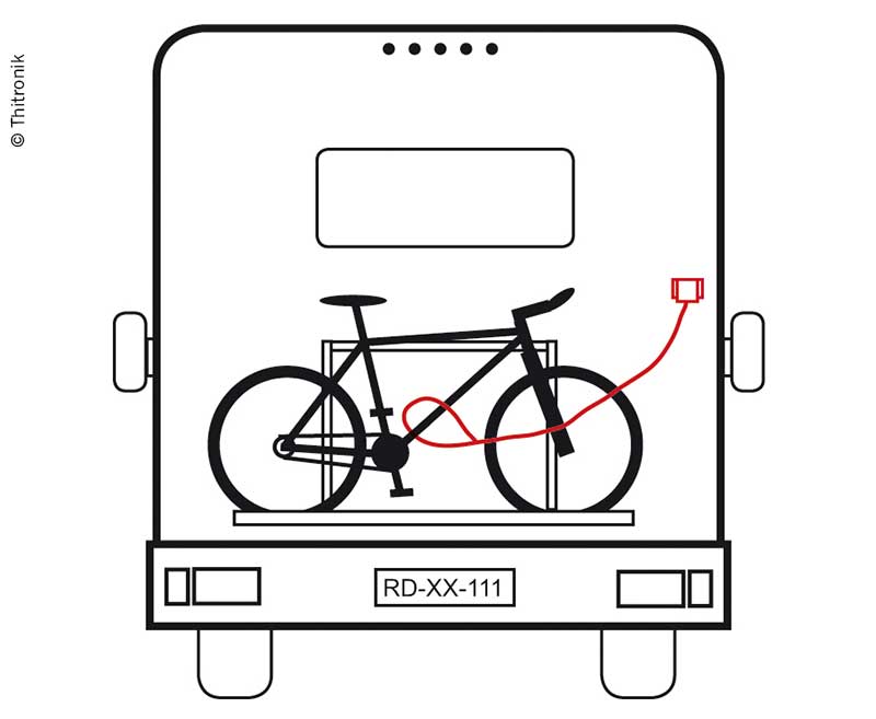 Weite den Schutz Deines Alarmsystems auf Deine mobilen Gegenstände wie Fahrräder, Surfboards, Möbel oder Motorräder aus. Das geht ganz einfach mit der Funk-Kabelschleife. Das Kabel wird durch die zu sichernden Gegenstände geführt, z.B. Fahrradrahmen oder Armlehne. Anschließend wird die Sendeeinheit durch die Schlaufe am Ende des Kabels geführt. Jetzt nur noch die Sendeeinheit in der Halterung einhängen und Alarmanlage aktivieren: Dein Reisemobil und die Gegenstände außerhalb des Fahrzeugs sind geschützt.