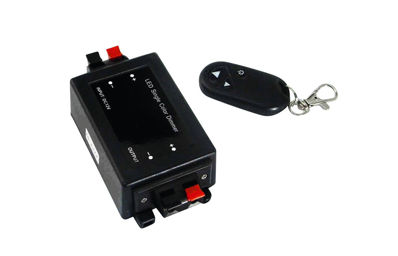 12-V-Dimmer mit Fernbedienung für Leuchten bis 96 W. Funktionen der Fernbedienung: Heller / Dunkler / An / Aus.