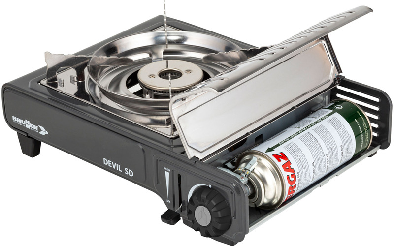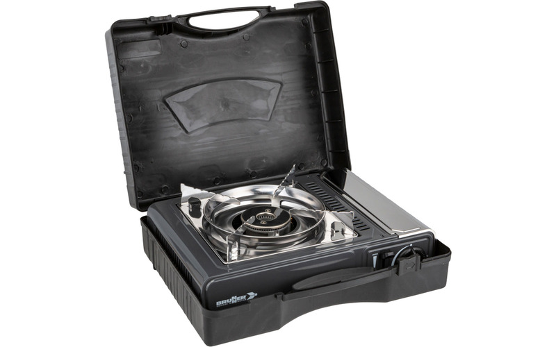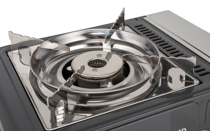 Kartuschen-Gaskocher mit Zündsicherung, integrierter Piezozündung und Edelstahl-Brenner. Gaszufuhr regelbar. Inklusive Transportkoffer. Betrieb mittels Gaskartuschen .
