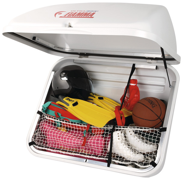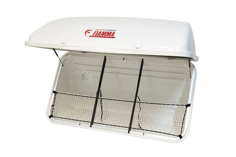 ABS-Plus Kunststoff. Stossfest und witterungsbeständig. Für Wohnmobile und Kleinbusse mit Heckträger. Inklusive Befestigungsmaterial. Mit Sicherheitsnetz gegen Herausfallen des Ladegutes. TÜV / GS – Zulassung.