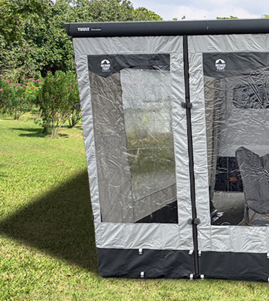 ✔ Front: 1x Panel, 8 Kederprofile á 50cm, 2 Gardinen, Leitern, Heringe, Abpannleinen, Packtasche.