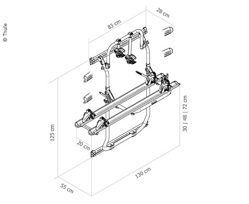 Der Heckträger passt für Fiat Ducato, Citroen Jumper, Peugeot Boxer und RAM Pro Master ab 2007. Türen können ohne Entfernen der Fahrräder geöffnet werden. Der Träger wird mit Klammern und PU-Kleber am Fahrzeug befestigt, es ist kein Bohren erforderlich. Träger ist leicht abnehmbar. Fahrradplattform in 3 Höhenpositionen. Länge Fahrradschienen:126 cm, maximale Traglast pro Fahrrad: 19 kg.