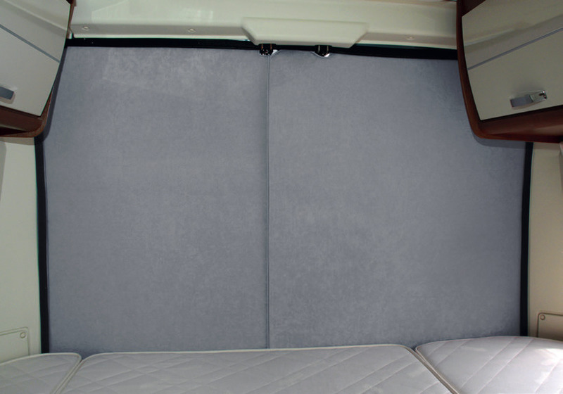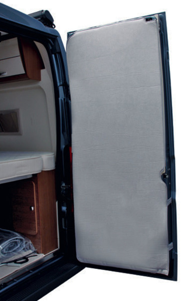 Zweiteilige Hecktürisolierung (hoher Türausschnitt) mit Magnetbefestigung. Beide Flächen überlappen in der Mitte. Material: Sandwichkonstruktion mit 8 mm dicker, 3-lagigem Iso-Material und einem Polyestervelour identisch mit dem Material für die Schiebetürisolierung bzw. mit den Thermovorhängen für das Fahrerhaus.