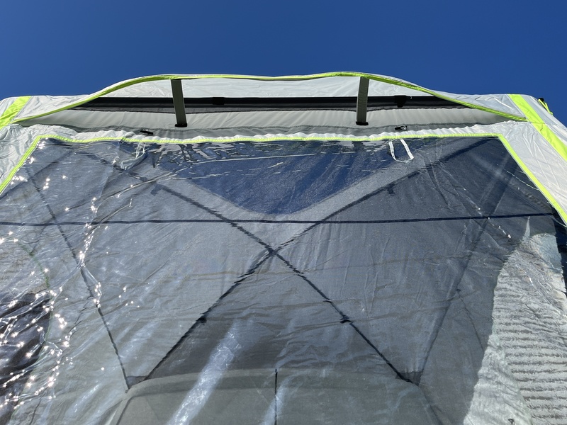 Der Clou beim neu entwickelten Heckzelt UPGRADE DOME PREMIUM: Die Flügeltüren können bei aufgebautem Zelt geschlossen werden. Das Kuppeldach verleiht ein großzügiges Raumgefühl und verhindert gleichzeitig Wassersäcke bei Regen und das U-förmige Stahlrohrgestell verspricht Stabilität. Die Vorderwand besitzt eine große Tür (als Sonnensegel nutzbar) sowie ein transparentes Fenster mit Innenabdeckung und zusätzlichem Moskitonetz. Die Seitenwände mit Ovalfenstern sowie das Oberlichtfenster im Dach gewähren eine gute Rundumsicht. Eine Bodenplane mit integriertem Windschutz unter der Stoßstange, die mit Klett fixiert wird, komplettiert das Zelt.