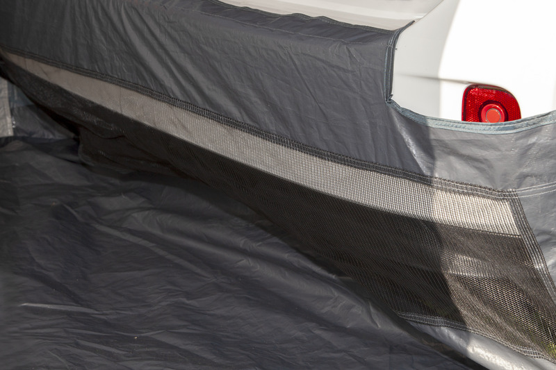Kein Gestänge, geringes Packmaß, leichtes Gewicht und einfacher Aufbau machen das Upgrade Premium zum perfekten Heckzelt für Kastenwagenfahrer. Die neuen Austattungsmerkmale wie Moskitonetz in allen Ziptüren, Schürze zum Stoßfänger und eingenähte Bodenwanne bieten zusätzlichen Komfort. Die Fronttür kann als Sonnensegel aufgestellt werden und die beiden Seiteneingänge haben getönte Fenster. Der Bestseller mit Schutz vor Moskitos und Insekten hat eine zusätzliche Lüftung über dem Eingang und kann mit Clips seitlich am Fahrzeug befestigt werden. Die eingenähte Bodenwanne kann an der Stoßstange befestigt werden.