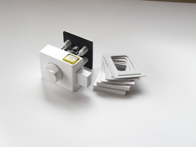 Weiße Türsicherung/Zusatzschloss für Aufbautüren.