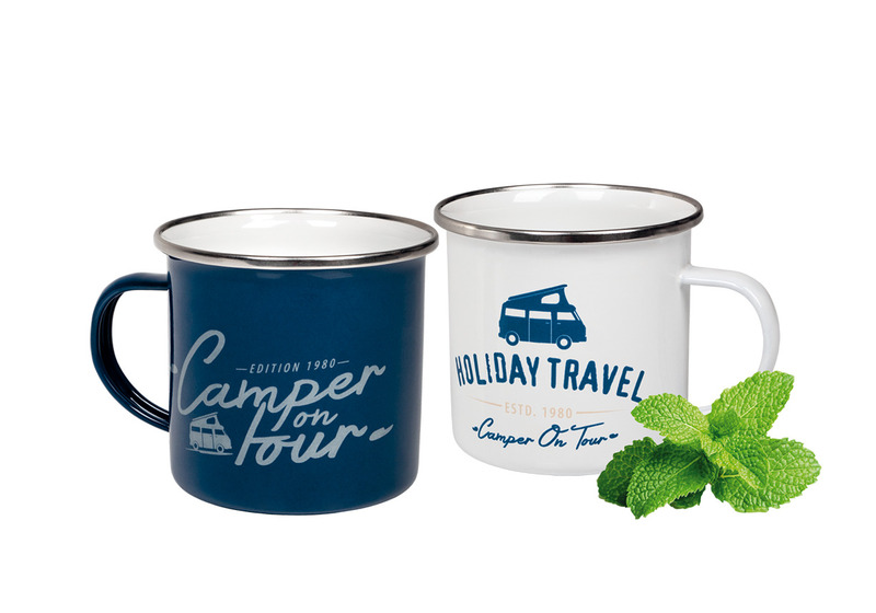 2 Emaille-Becher aus der HOLIDAY TRAVEL Serie in den Farben blau mit CAMPER ON TOUR-Druck und weiß mit HOLIDAY TRAVEL-Druck (jeweils beidseitig bedruckt).