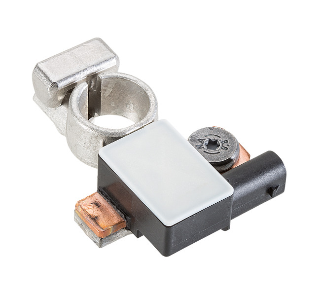 Der IBS Generation II wird über die Polklemme unmittelbar am Minuspol der Batterie befestigt. Neben der Klemme besteht der mechanische Anteil des Sensors aus den Komponenten Shunt und Massebolzen. Am Massebolzen kann das bestehende Massekabel komfortabel mit einem Kabelschuh befestigt werden.