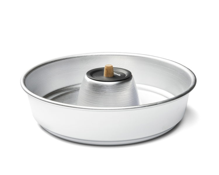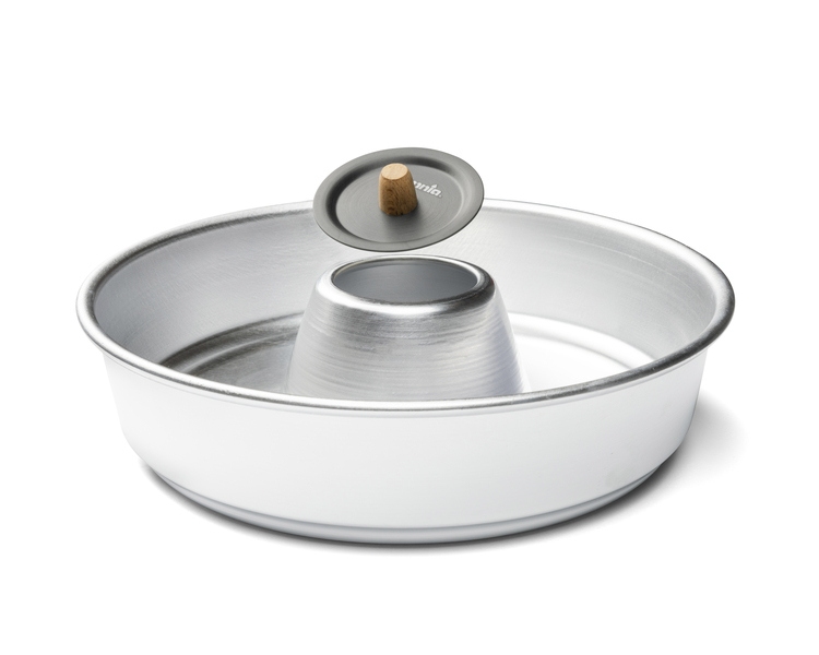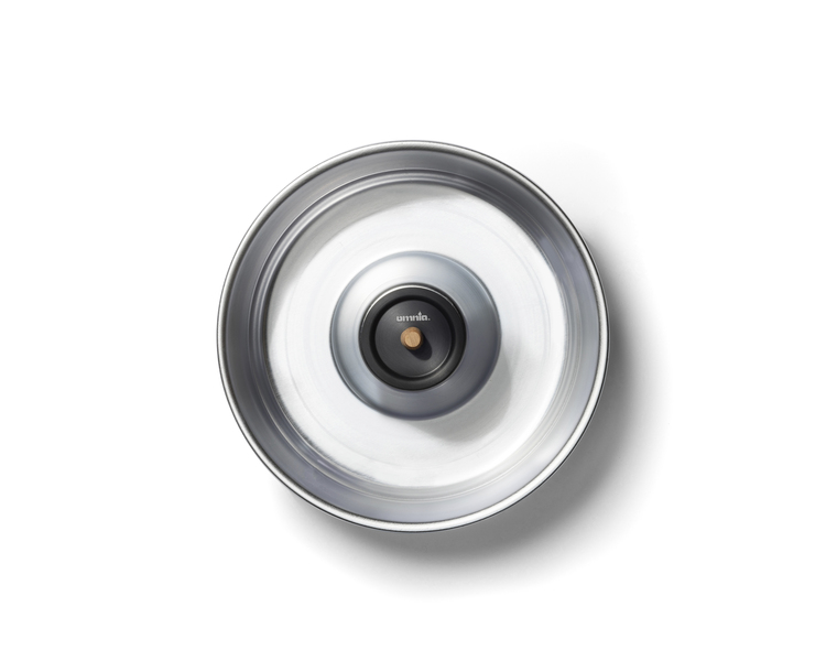 Ein speziell entwickelter Deckel aus schwarz eloxiertem Aluminium verschließt die zentrale Öffnung der Omnia-Pfanne und verhindert so das Verschütten von Speisen beim Kochen und Servieren. Außerdem verleiht er Ihrer Tischdekoration eine elegante und stilvolle Note.