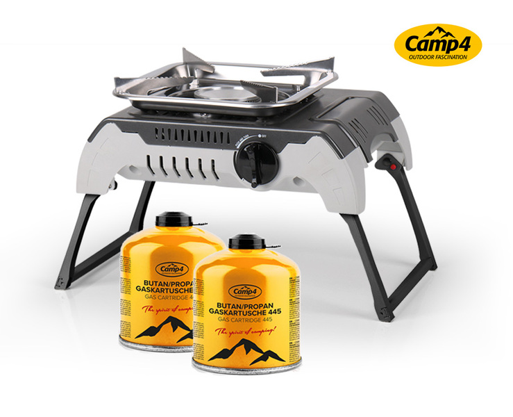 Kartuschenkocher mit Zündsicherung, ausklappbaren Füßen+ 2 Kartuschen