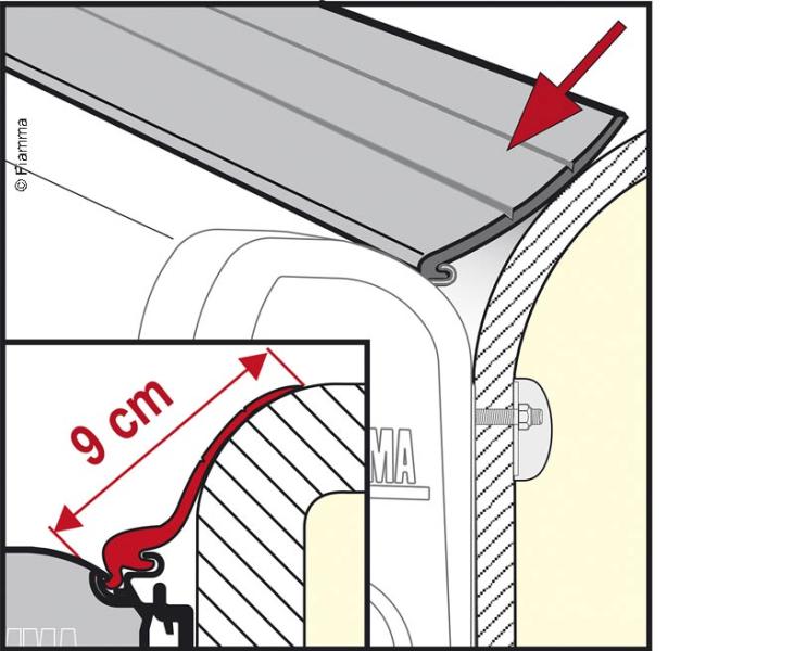 Rain Guard L – Für Markisen, die mit bis zu 9 cm abstehenden Adaptern oder an gewölbten Wänden montiert sind. Lieferbar in laufenden Metern.