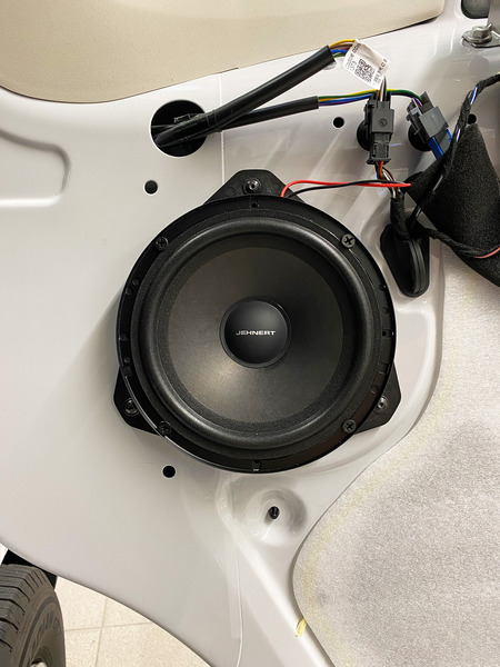 In akustischer Feinabstimmung sorgt das fahrzeugspezifi sche 3-Wege-Soundsystem für ein sattes Tiefton-Fundament und erzielt ein druckvolles, spritziges Klangbild. Hochwertige 26mm Softdome-Neodym-Hochtöner und 80mm High-End-Mitteltöner im Armaturenbrett perfektionieren das Klangbild durch ein sehr räumliches und detailreiches Bühnenbild. Der fahrzeugspezifi sche Montageadapter ermöglicht die Integration eines 165mm JEHNERT Power Woofer in den werkseitigen Einbauöff nungen der Fahrzeugtüren. Das GFK-Mittel-/ Hochton-Modul für das Armaturenbrett ist mit hochwertigem Kunstleder in der Farbe schwarz bezogen.