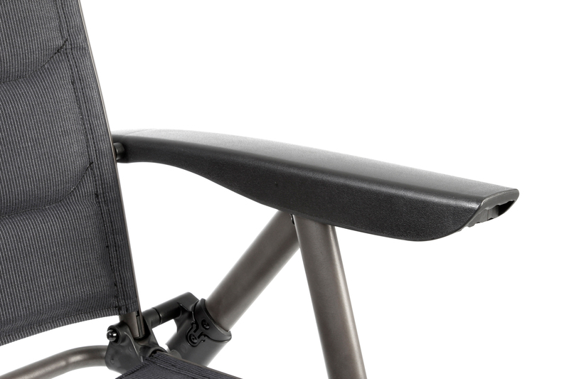 Hochwertiger Campingstuhl, klappbar, ultraflach und atmunsaktiv mit verstellbarer Rückenlehne.